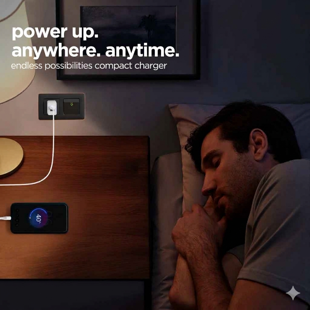Compact, Lightweight & Travel-Friendly Design, Dual USB 2.4A Output for charging two devices simultaneously •, Fast Charging, Smart Charging with IC Protection Layers against heat, overcharge & short circuit •, Universal Type-C Compatibility – mobiles, TWS earbuds, BT headphones, tablets •