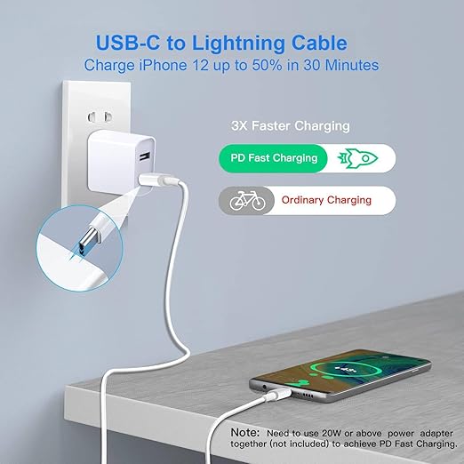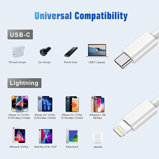 - Wide Compatibility: Supports PD fast charging up to 3A for iPhone 14/14 Pro/14 Pro Max/14 Plus, iPhone 13 series, iPhone 12 series, iPhone 11 series, XS/XR/X/8 series, and iPads including iPad 8th Gen, iPad Pro, iPad Air 3, and iPad Mini 5. (Note: USB-C wall charger required for fast charging.)